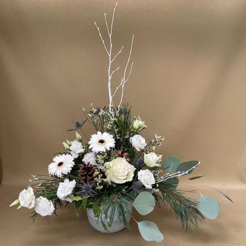 Our winter arrangement in a ceramic pot with white flowers and touches of winter.