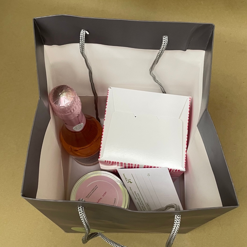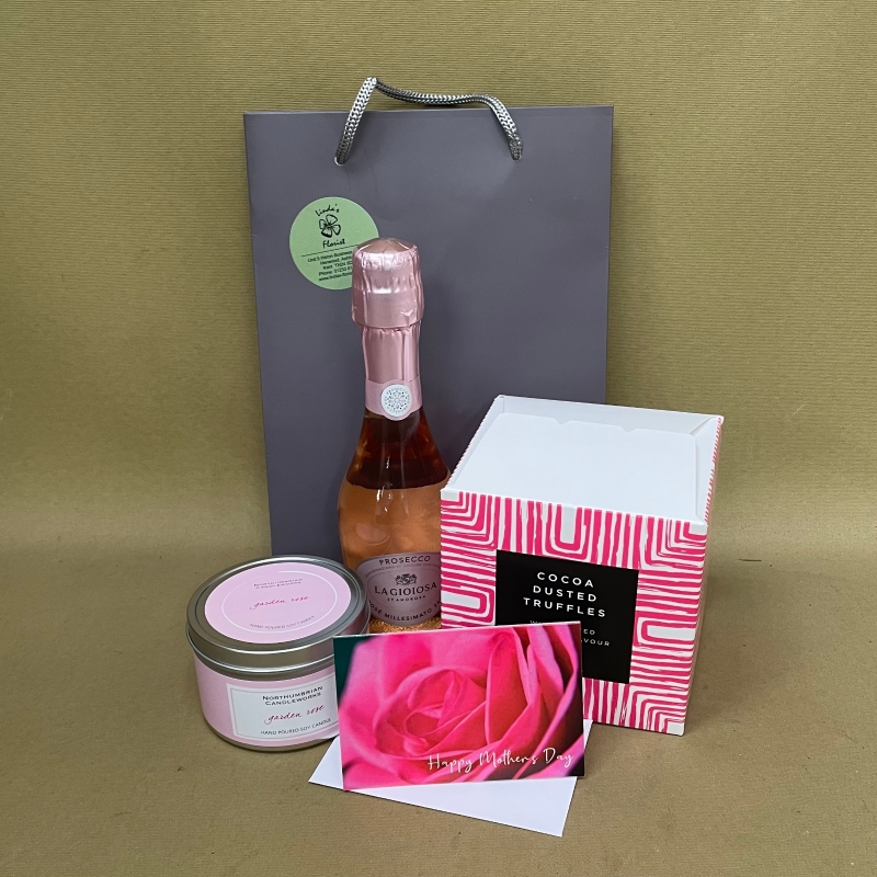 200ml 10.5% Vol. Rose Prosecco and a garden rose candle in a tin.
