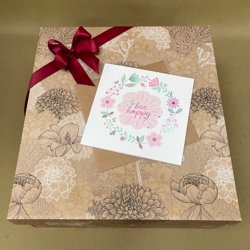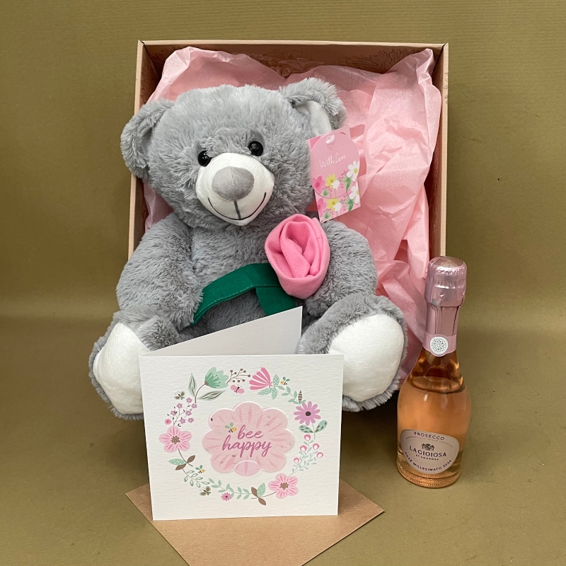 A hug for someone special, cute teddy holding a rose packaged in a gift box with large card and a mini bottle of prosecco.