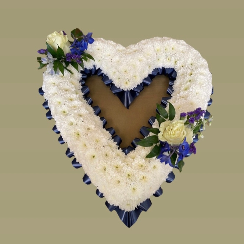 An open heart with white chrysanthemum base, ribbon edge and mount in your choice of colour