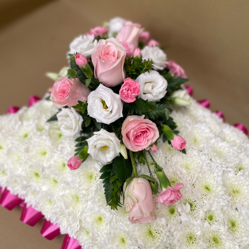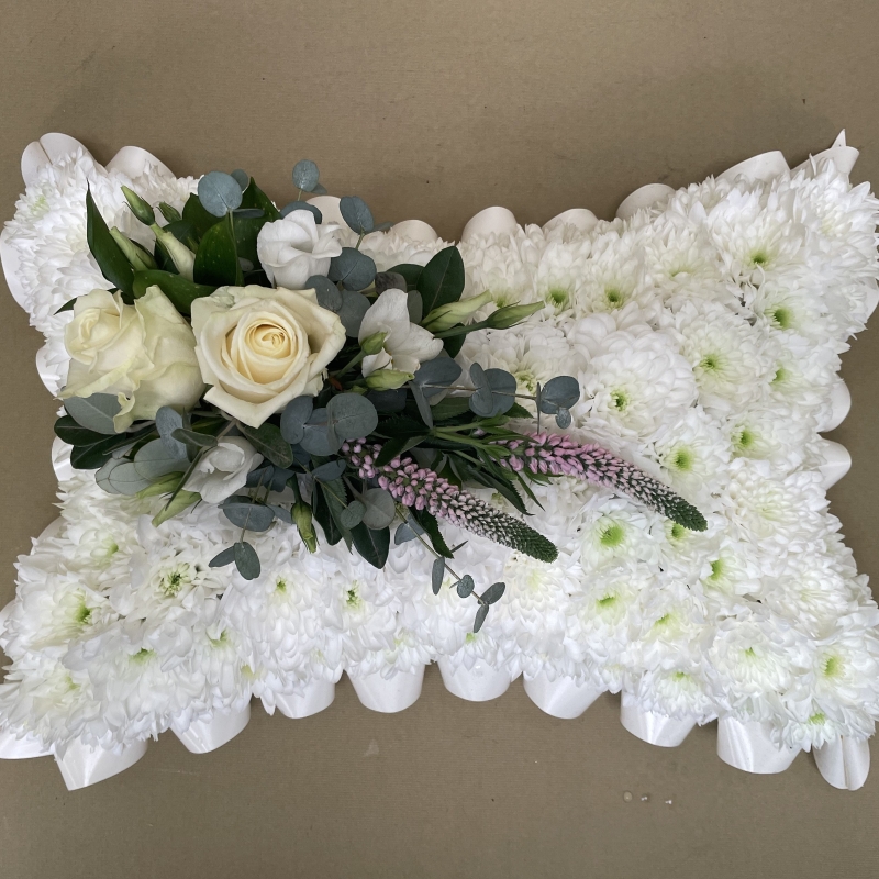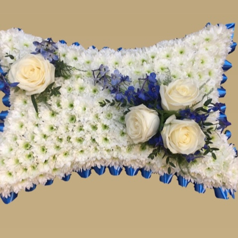 Our pillow is based in white chrysanthemums with coloured ribbon and a mount to match